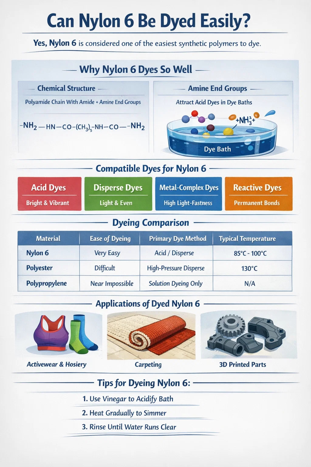 Habang ang Nylon 6 ay natural na nakakatanggap ng kulay, maraming mga salik ang dapat pamahalaan upang matiyak ang isang mataas na kalidad na pagtatapos.