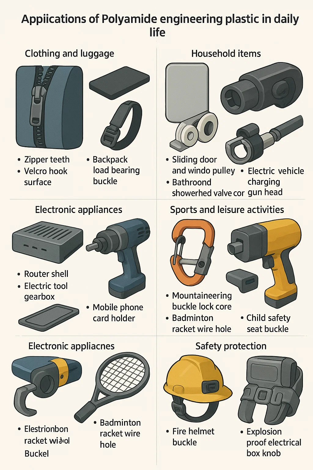 Ang application ng Engineering plastic polyamide Sa pang -araw -araw na buhay ay sumisid sa maraming mga patlang, at ang pangunahing halaga nito ay namamalagi sa mga katangian ng pagpapalit ng bakal na may plastik at pagiging magaan at matibay. Ang mga tiyak na karaniwang mga sitwasyon ay ang mga sumusunod: