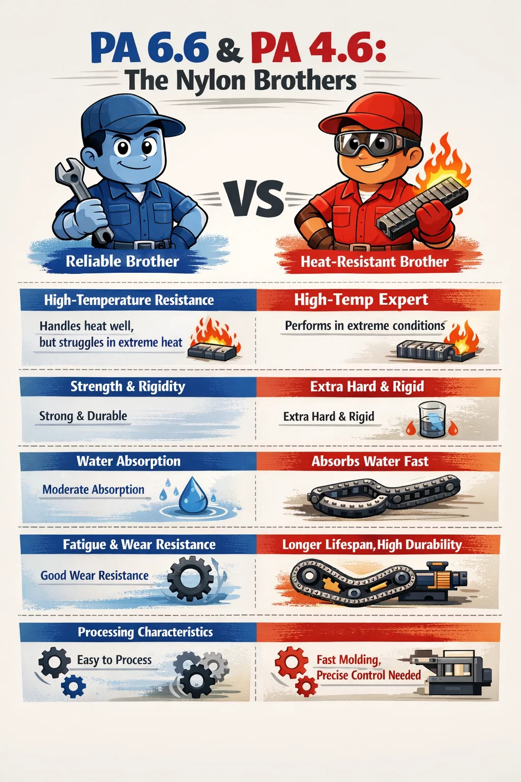 Sa pamilya ng nylon, ang PA 6.6 at PA 4.6 ay parang dalawang magkapatid, magkatulad sa hitsura ngunit may magkakaibang personalidad at kakayahan. Parehong kabilang sa pamilyang polyamide, ngunit medyo naiiba ang kanilang pagganap kapag nakikitungo sa mataas na temperatura at mga aplikasyon ng mataas na stress.