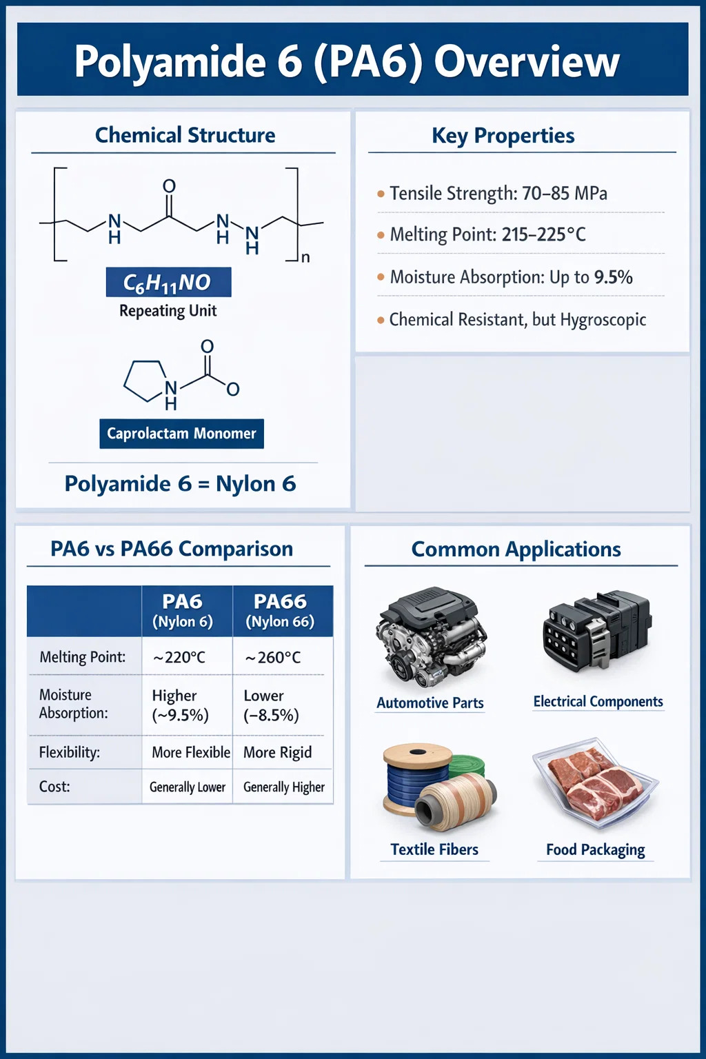 Sa buong mundo, ang Polyamide 6 ay isa sa pinakakinagamit na engineering thermoplastics. Lumampas ang taunang dami ng produksyon 4 milyong metriko tonelada , at ang materyal ay mahalaga sa mga industriya mula sa automotive at electronics hanggang sa mga tela at packaging ng pagkain. Ang pag-unawa sa kung ano ang ibig sabihin ng PA6 ay ang panimulang punto lamang — ang chemistry nito, mga katangian ng pagganap, at pag-uugali sa pagpoproseso ay tumutukoy kung bakit ito naging nangingibabaw sa komersyo.