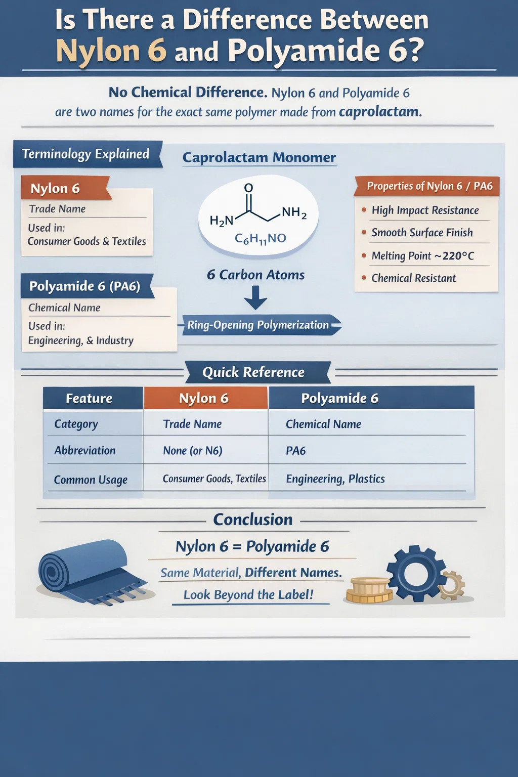 Upang ilagay ito nang simple: walang kemikal na pagkakaiba sa pagitan ng Naylon 6 at Polyamide 6. Ang mga ito ay dalawang magkaibang pangalan para sa eksaktong parehong polimer. Ang "Nylon" ay ang kilalang pangalan ng kalakalan na oihinal na nilikha ng DuPont, habang ang "Polyamide" ay ang pormal na pangalan ng kemikal na ginamit sa agham at inhinyero. Pag nakita mo Naylon 6 sa isang label ng produkto ng mamimili at Polyamide 6 sa isang teknikal na data sheet, ang mga ito ay tumutukoy sa parehong materyal na ginawa mula sa caprolactam monomer.