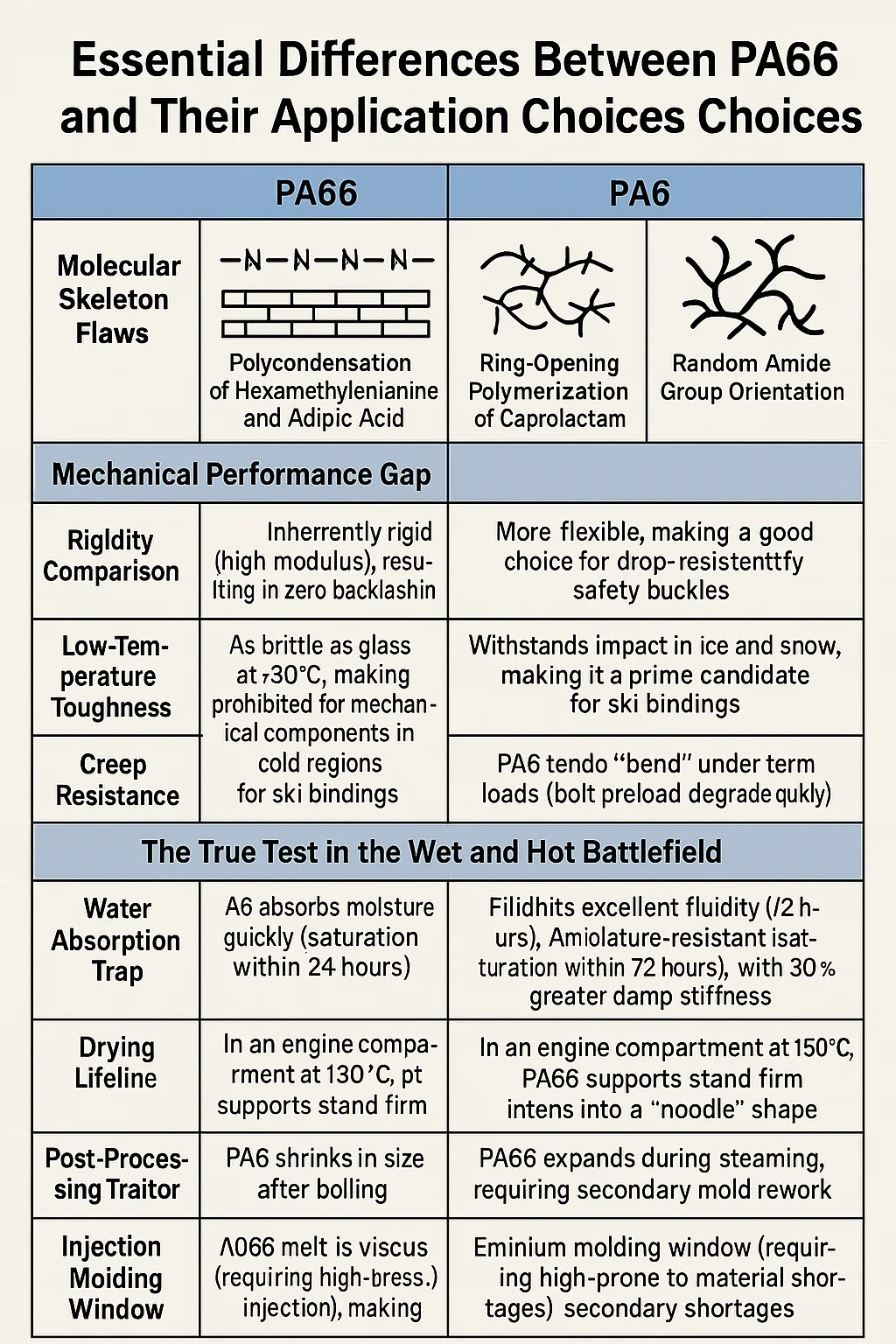 Ang mababang temperatura na katigasan: Ang PA66 ay kasing malutong tulad ng baso sa -30 ° C, na ipinagbabawal ito para sa mga mekanikal na sangkap sa mga malamig na rehiyon; Ang PA6 ay may epekto kahit na sa yelo at niyebe, na ginagawa itong isang punong kandidato para sa mga bindings ng ski.
